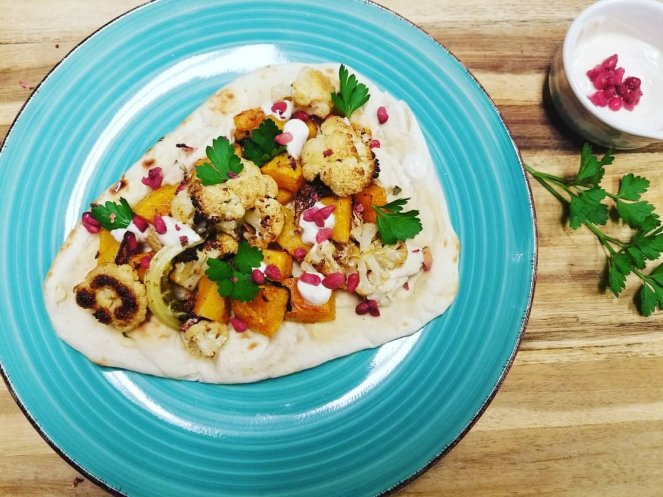Now, I know Shakshuka is traditionally cooked with eggs and served for breakfast.. However since this is an egg free zone, I topped this quite happily with Almond milk yogurt, and beefed it up with a protein hit of chickpeas which worked beautifully. And I do feel this is a great dish, adaptable to anytime of day. I’d love this as brunch or dinner. Or you know, at three a.m after binge watching Greys. Whatever makes you happy.