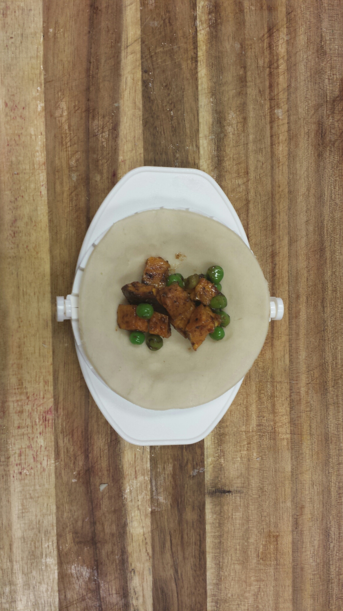 Roll the dough to about 5 mm. And start cutting in circles at the size you want. Remeber these are being folded around a filling so not too small. Mine were 4″ and I could use the back of the cutter. But you can make these without my little toy too so don’t worry. Once I had all my circles cut I turned my press over and got filling. The filling should be pretty cool now , you don’t want it warm or the pastry won’t crisp up.