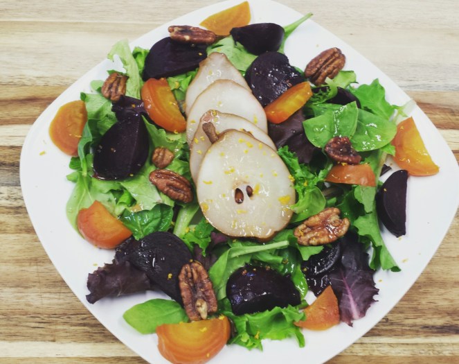 Throw a load of Greens onto a serving dish and top with the sliced Beets. Pop your Pear on there too.