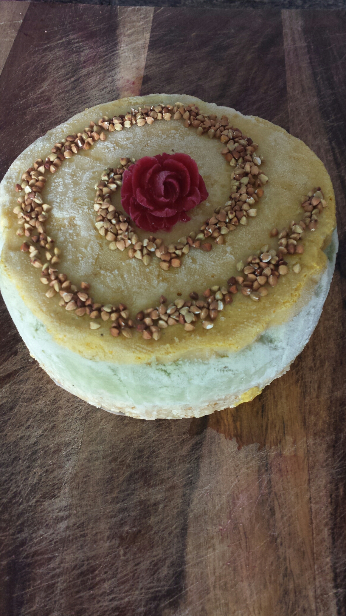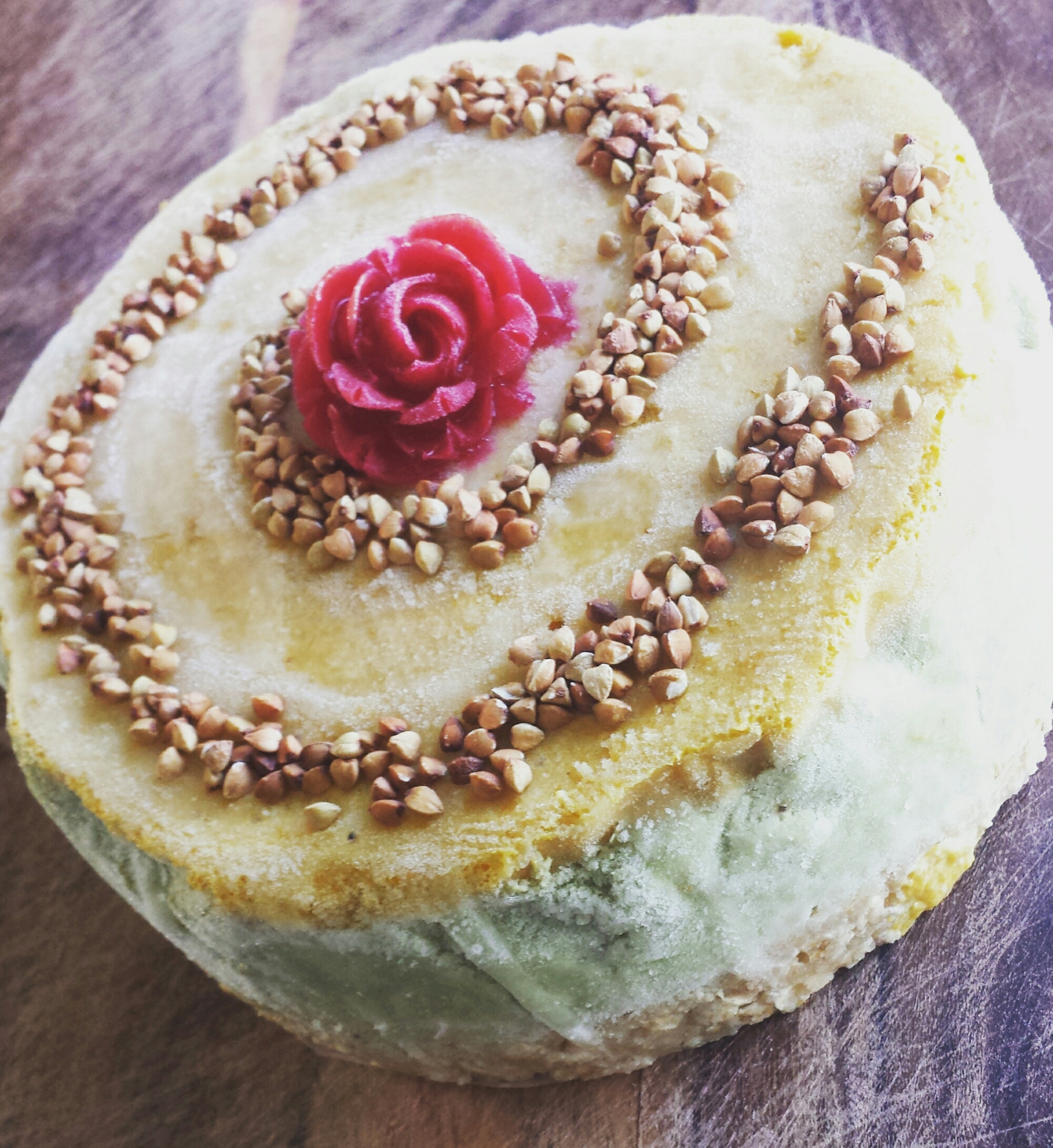 I added a Beetroot juice frozen rose and Buck wheat I had toasted for 10 mins in the oven to decorate (obvs toasted Buckwheat isn’t raw for those out there that keep it raw , you could use fruit or perhaps be pollen if not Vegan ).